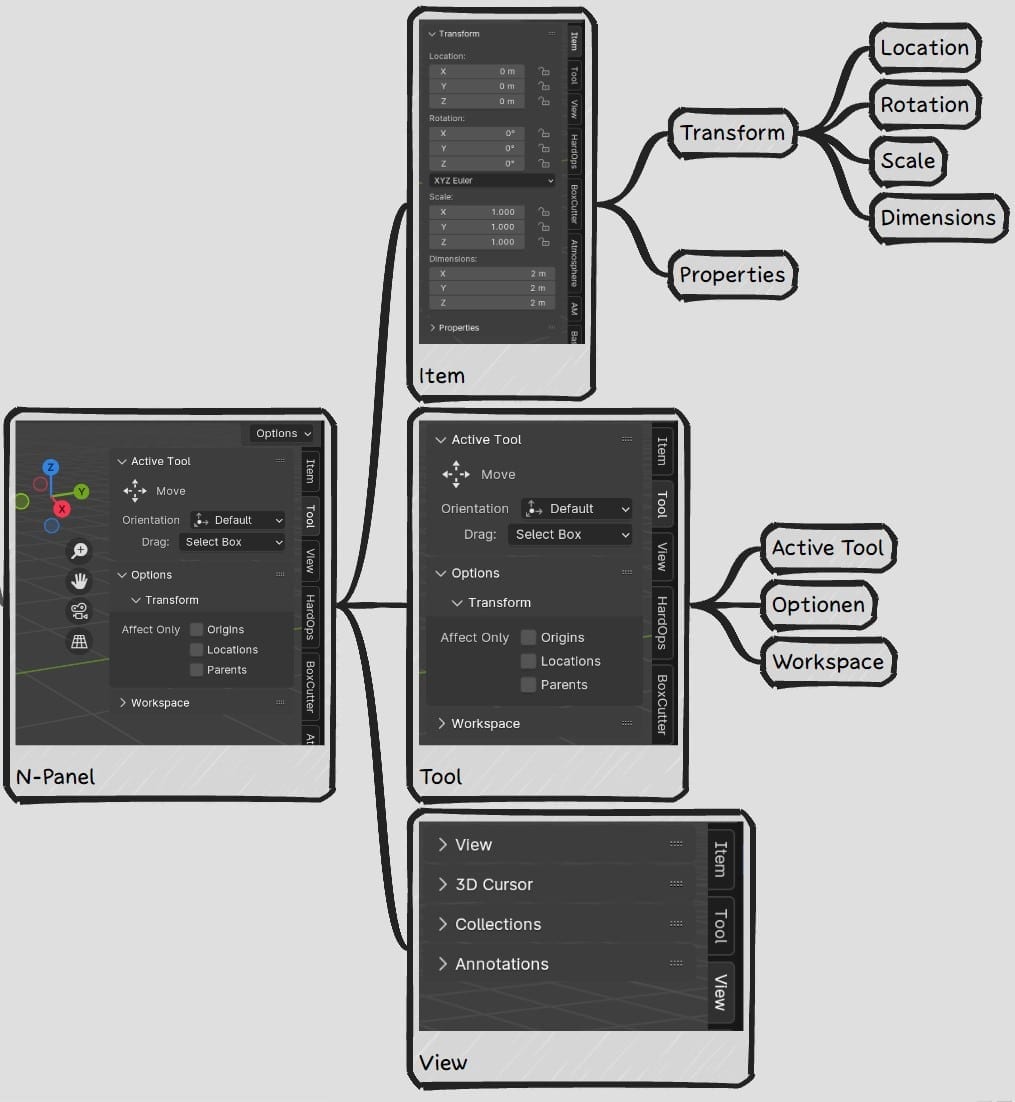 Im N-Panel befinden sich nicht nur viele eurer Blender Addons, sondern auch einzigartige Blender Werkzeuge, die ihr nur hier findet! Jeder Profi kommt immer wieder hierher zurück. Die zusätzlichen Möglichkeiten zur Transformation und Beeinflussung von Objekten sind wirklich extrem cool!