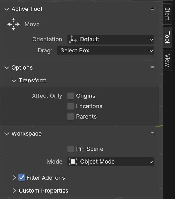 - Workspace: Anpassungen und Einstellungen für den Arbeitsbereich. Auch Addons können hier gefiltert werden.