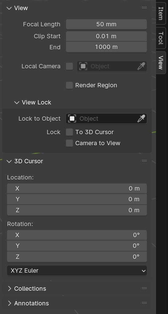 - 3D Cursor: Einstellungen für den 3D-Cursor. Falls du den 3D Cursor mal seitlich verschieben musst, ist dies hier die einzige Möglichkeit in Blender.