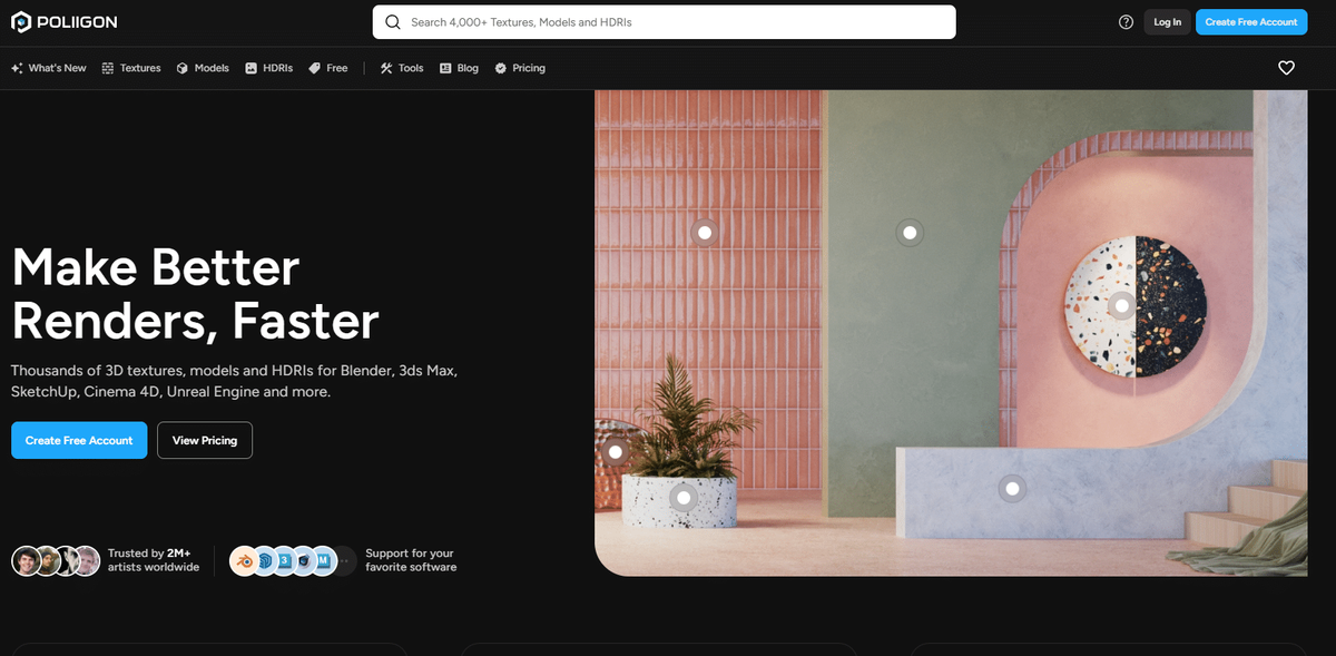 Poliigon bietet sowohl kostenlose als auch Premium-PBR-Texturen (Physically Based Rendering) an. Diese sind für mehrere 3D-Bearbeitungstools verfügbar, einschließlich Blender. Die Texturen von Poliigon eignen sich für VFX, Game Design, Animation und Produktvisualisierung.